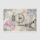 Papel de aspecto vintage con rosas, hortensias, flourishes, una abeja reina coronada, la Torre Eiffel y mariposas.