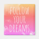 ¡Sigue tus sueños! Manténgase inspirado con este colorido imán de impresión en nube rosa y naranja. Manténgase como inspiración diaria para usted mismo, o dáselo a un amigo como un pequeño regalo motivador. Excelente para un graduado, estudiante universitario, amigo que empieza un nuevo negocio.