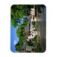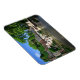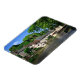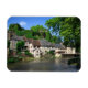 Revista rectangular de recuerdo con el castillo y el pintoresco pueblo histórico de Ségur-le-Château con sus casas de entramado de madera junto al río Auvézère en Limousin, Francia.