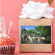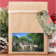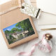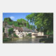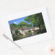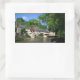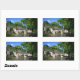 Pegatina fotográfico rectangular del castillo y del pintoresco pueblo histórico de Ségur-le-Château, con sus casas de entramado de madera junto al río Auvézère en Limousin, Francia.