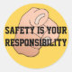 Pegatina amarilla con el dedo señalador y el texto "La seguridad es tu responsabilidad" para promover la seguridad en el lugar de trabajo.