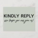 En el texto editable se colocó la "respuesta amable", grande y atrevida, en el frente. En una moderna escritura informal, a continuación aparece un gráfico que representa "¡esperamos que puedan unirse a nosotros!". En la parte posterior, se utilizó el mismo tipo de letra único para crear gráficos que decían "rsvp", "m", "amablemente entregar a:" y "elección de menú para cada invitado:" El resto del texto es editable. Utilice los campos de plantilla para personalizar todo lo que desee. El fondo puede cambiarse a cualquier color que le convenga. // 100 //