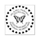 Este sello redondo presenta un círculo decorativo de corazones que enmarcan todo el diseño. El nombre se muestra en una curva suave en la parte superior, seguida por el número de teléfono directamente debajo. En el centro, un gráfico de una mariposa aporta un toque encantador y personal. La dirección está elegantemente curvada alrededor de la parte inferior en dos líneas separadas, completando el diseño circular.