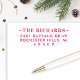 Este sello de goma autoentintable elegante presenta el apellido de su familia flanqueado por delicados guiones em y combinado con su dirección de devolución en tipografía serif refinada. Diseñado para coordinar con tarjetas de vacaciones y correspondencia familiar durante todo el año para un aspecto clásico minimalista. Un recuerdo atemporal para familias, nuevos propietarios y regalos de cierre de inmobiliarias.