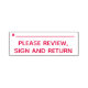 Este diseño de sello de goma sin formato incluye el mensaje "Por favor revise, firme y devuelva", junto con una línea que indica que una firma o iniciales podrían ser escritas arriba. Tal vez podría ser utilizado por un profesor o un profesional administrativo para solicitar que alguien revise y reconozca el contenido de un documento.