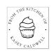 Perfecto para etiquetar tus deliciosas golosinas caseras, este sello personalizado "de la cocina de" y tu nombre curvado alrededor de un ilustracion de quequitos.