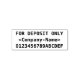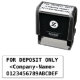 Este sencillo diseño de sello de goma incluye el mensaje "ÚNICAMENTE PARA DEPOSITIVO", junto con un nombre personal/comercial personalizado y un número de cuenta. Podría ser utilizado por un trabajador administrativo, un empleado administrativo o una persona para agregar de manera eficiente un respaldo restrictivo a un cheque.