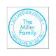 Add a touch of personal charm to your mail with this beautifully designed self-inking address stamp. Featuring a classic circular layout with a vibrant blue hue, this stamp proudly displays 'The Miller Family' name. Below your family name, your street address and city, province, and postal code are elegantly presented in a clear, easy-to-read font. Perfect for sealing envelopes, adding a unique touch to stationery, or even for craft projects, this stamp makes a statement of home and belonging. Its self-inking mechanism ensures quick and consistent impressions, making it a practical and stylish addition to any home office or stationery collection. Make your mark with this lovely family address stamp.