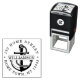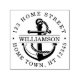 Un diseño de estampado personalizado de autotinta circular con detalles de dirección circular alrededor de tu nombre puesto sobre un ancla y cuerda.