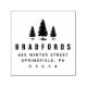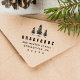 Sello de tinta propia con pinos gráficos y su dirección.