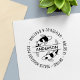 Un elegante sello de dirección para una pareja con un simple ilustracion vectorial blanco y negro de un par de peces koi japoneses dando vueltas entre sí. El nombre de la familia está escrito en el ilustracion mientras que los nombres y la dirección están impresos a su alrededor. Tenga en cuenta que puede que necesite ajustar la información introducida agregando o eliminando algunos caracteres o espacios, para que el nombre y la dirección estén correctamente alineados.