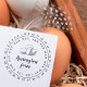Este sello de caucho auto-tinta de una granja familiar de productos dulces presenta huevos pintados a mano y meses y fechas en una tipografía redonda. El conjunto de servidores o la propiedad de origen de la familia se muestra en el tipo de letra del guión. Perfecto para ser utilizado como un sello de cartón de huevo que tiene todos los días y fechas y sólo tiene que redondear la fecha correcta. Simplemente haga clic en "Personalizar" y añada sus propios detalles!