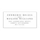 Este sello de dirección mínima de retorno incluye dos nombres y dos apellidos en la moderna y elegante tipografía serif, unida por "y" palabra en un tipo de letra simple más pequeño. Debajo hay una dirección de retorno en la misma letra simple. Este sello es perfecto para una pareja soltera o casada con diferentes apellidos. Para personalizar este sello, simplemente haga clic en el botón "Personalizar".