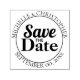 Un diseño sencillo y elegante de un círculo en el que las palabras "guardar la fecha" aparecen en un guión grande y en negrita con el nombre de las parejas nupciales y la fecha del boda o evento en el borde exterior.