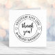 Sencillo sello redondo con mensaje de agradecimiento rodeado de texto de personalizable. Tenga en cuenta que puede que necesite ajustar la información introducida agregando o eliminando algunos caracteres para que el texto esté correctamente alineado.