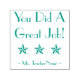 Este motivante diseño de sellos de goma incluye el inspirador mensaje "¡Hiciste un gran trabajo!" y el nombre de un profesor personalizado. También tiene forma de estrella decorativa. Podría ser utilizado por un profesor, educador, instructor o tutor al marcar las asignaciones, para indicar que el estudiante ha tenido un buen desempeño.