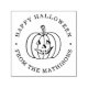 Añada encanto sellado a mano a su truco de Halloween o a sus bolsos de regalo, favores de fiesta y tarjetas con nuestro sello de goma personalizado, que incluye "Halloween Feliz" y tu(s) nombre(s) rodeando un espeluznante jack o ilustracion de calabaza de linternas.