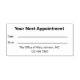 Esta estampilla dice "Su próxima cita" en negrita en la parte superior. También hay líneas para la fecha y hora del nombramiento. En la parte inferior se muestra el texto que se puede editar para el nombre del médica (o el nombre de la práctica) y el número de teléfono. Todo el texto se puede editar o eliminar.
