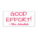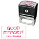 Este divertido diseño de sello de goma muestra el motivador mensaje "¡BUEN ESFUERZO!" y el nombre personalizado del profesor o educador. Podría ser utilizado por un profesor, educador o tutor al marcar tareas, para indicar que un estudiante ha tenido un buen desempeño.