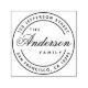 Un sello de dirección de devolución redondo y elegante. En el centro, el nombre está escrito en una escritura caligráfica elegante, con la palabra "familia" en mayúsculas pequeñas debajo. Está rodeado por la dirección, escrita entre dos círculos, con mayúsculas, la calle arriba, la ciudad y el estado debajo. El círculo más pequeño está interrumpido.