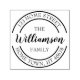 Un diseño clásico de sello autoentintado personalizado circular que presenta un borde de doble círculo con un nombre de guión elegante y texto de dirección de devolución. Diseñado por Thisisnotme©
