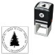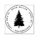 En el centro hay un pinar. Está rodeado por el nombre y la dirección, escrito como texto en arco en círculo, con mayúsculas, el nombre de arriba, la dirección de abajo. Todo esto está dentro de un círculo. Recomendado para tarjetas de Navidad.