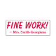 Este diseño de sello presenta el mensaje "TRABAJO FINO!", y un nombre de profesor personalizado. Podría ser utilizado por un profesor mientras califica tareas para reconocer a un estudiante que ha hecho un trabajo particularmente bueno.