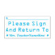 Este diseño básico de sellos de goma incluye el mensaje "Por favor, Rótulo y vuelta a", junto con una línea que podría ser escrita anteriormente. También incluye el nombre de un profesor personalizado o educador. Tal vez podría ser utilizado por un profesor, educador o tutor para solicitar que los padres o tutores de un estudiante revisen el trabajo del estudiante en un examen, papel u otra tarea.