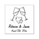 Sello personalizado pre-entintado para celebración de boda. Este sello de boda es decorado con ilustraciones de copas de champán y corazones. Está personalizado con los nombres de los recién casados y su fecha de boda, todo impreso en letra cursiva.