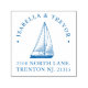 Sellos de tinta de temática náutica modernos y elegantes. Los sellos incluyen un ilustracion náutico en barco de vela de estilo vintage, rodeado por el nombre de la novia y del novio. Debajo hay una dirección de correo. Todos los elementos de este elemento se pueden ajustar mediante la función de personalización.