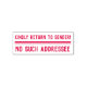 Este diseño básico de sellos de goma incluye los mensajes "¡Por favor, regresen al remitente!" y "No hay tal destinatario". Podría utilizarse para indicar que el correo recibido se ha enviado a la dirección equivocada o a un destinatario desconocido, y debe devolverse al remitente.