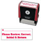 Este diseño básico de sellos de goma incluye el mensaje "Por favor, revise, corrija, inicial y vuelta", junto con una línea que podría escribir una firma o iniciales más arriba. Tal vez podría utilizarse para pedir que alguien examine y reconozca el contenido de un documento.