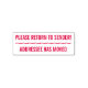 Este sencillo diseño de sellos de goma incluye los mensajes "¡POR FAVOR, VUELVA A ENVIAR!" y "LA DIRECCIÓN SE HA MOVIDO". Podría utilizarse para indicar que el correo recibido se ha enviado a la dirección equivocada o que el destinatario es desconocido y debe devolverse al remitente.