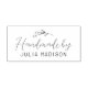 ¡Un sello de producto sencillo y dulce para todas tus necesidades creativas! Esta estampilla, que se autoinclina, está decorada con una estampilla botánica dibujada a mano en la parte superior del diseño, con dos brotes de flores circulares y tres pequeñas hojas. Debajo, "Handmade by" está escrito en hermosas letras de guiones. En la parte inferior, su nombre, nombre del artista, nombre de usuario de medios sociales, sitio web o nombre comercial se imprime en letras mayúsculas claras. ¡Un gran accesorio para cualquier creativo! Este es el sello de caucho que se auto-tinta - elige la carcasa y los colores de tinta según tu preferencia! Una versión en madera de este sello está disponible en mi tienda.