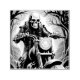 un esqueleto atrapado en una bicicleta de pandemonium. Recorriendo las ramas entrelazadas en el camino. Tenía un salto. Tiene pantalones de cuero negro y botas de moto y una chaqueta de cuero negro con un diseño de hueso en el traje de balanceo. Con el sol cayendo detrás de él. La neblina se eleva desde su alrededor hasta la noche oscura que se aleja con las estrellas de la noche.