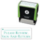 Este diseño básico de sellos de goma incluye el mensaje "Por favor, revise, Rótulo y devuelva", junto con una línea que podría escribir una firma o iniciales arriba. Tal vez podría ser utilizado por un profesor o un profesional administrativo para solicitar que alguien revise y reconozca el contenido de un documento.