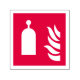 Botella con mango de perilla en la parte superior e icono de llama sobre fondo rojo.