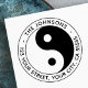 Devuelve el sello de goma de dirección con un símbolo yin yang y tu nombre y dirección en un moderno tipo de letra sans-serif.