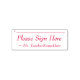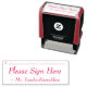 Este respetable diseño de sellos de goma incluye el mensaje "Por favor, Rótulo aquí", junto con una línea que podría ser escrita antes. También cuenta con un nombre personalizado de educador o profesor. Podría ser utilizado por un tutor, profesor o educador para pedir a los padres o tutores de un estudiante que revisen y reconozcan la nota que un estudiante obtuvo en un examen, un proyecto, un ensayo, un examen o algún otro trabajo escolar.