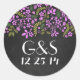 calcomanías de boda con flores moradas con las iniciales y la fecha boda del novio.