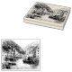 Un dibujo a mano en blanco y negro de Lynmouth, Devon, un encantador pueblo costero donde el río Lyn Oriental se encuentra con el mar. Este ilustracion de línea de estilo vintage captura el puerto, los barcos de pesca, las cabañas ribereñas y los acantilados espectaculares. Perfecto para admiradores de los viajes, la historia marítima y las tradicionales escenas de los pueblos ingleses.