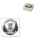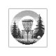 Ilustracion ai de un campo de golf de disco con cesta, pinos y puesta de sol en un estilo de videojuegos de 8 bits.