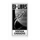 Un antiguo diseño de Libris con un motivo de corte de madera/ linocut que representa un cohete que orbita un planeta. Inspirados por imágenes soviéticas de exploración espacial de los años 50 y 60