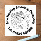 Compañía de techos con un hombre trabajando en tabletas. Un divertido techo de personalizado repara el ilustracion. Personalice su elección del nombre de la empresa y el número de contacto. Sello de goma del techo con los detalles de su empresa para imprimirlo en papel y papelería de la empresa