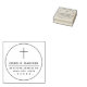 Devolver el sello de goma con una elegante y delgada cruz cristiana y su nombre y dirección de retorno dentro de un delgado borde redondo.
