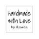 Sello de goma con el texto "hecho a mano con amor" en un tipo de letra escrito a mano y tu nombre a continuación.