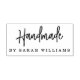 Sello de goma con el texto "hecho a mano" en un estilo de letra manuscrito moderno y su nombre a continuación.