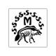 Un ilustracion de una hiena rayada caminando bajo el sol. La imagen se hizo con un tatuaje tribal de tinta negra. Entre el sol negro y la hiena negra está la letra M, m es corta para el monograma y puede ser personalizada a sus deseos.