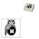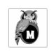 Un ilustracion de una espeluznante lechuza que sale de la vista lateral. El pájaro está mirando sobre su hombro. Debajo del ala de las lechuzas hay un ojo ampliado que se supone es el marco de un monograma. El M es corto para monograma y puede ser personalizado para sus iniciales.