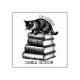 Este sello de goma de "Ex Libris" incluye un gato vintage encima de una pila de libros con un nombre personalizado.